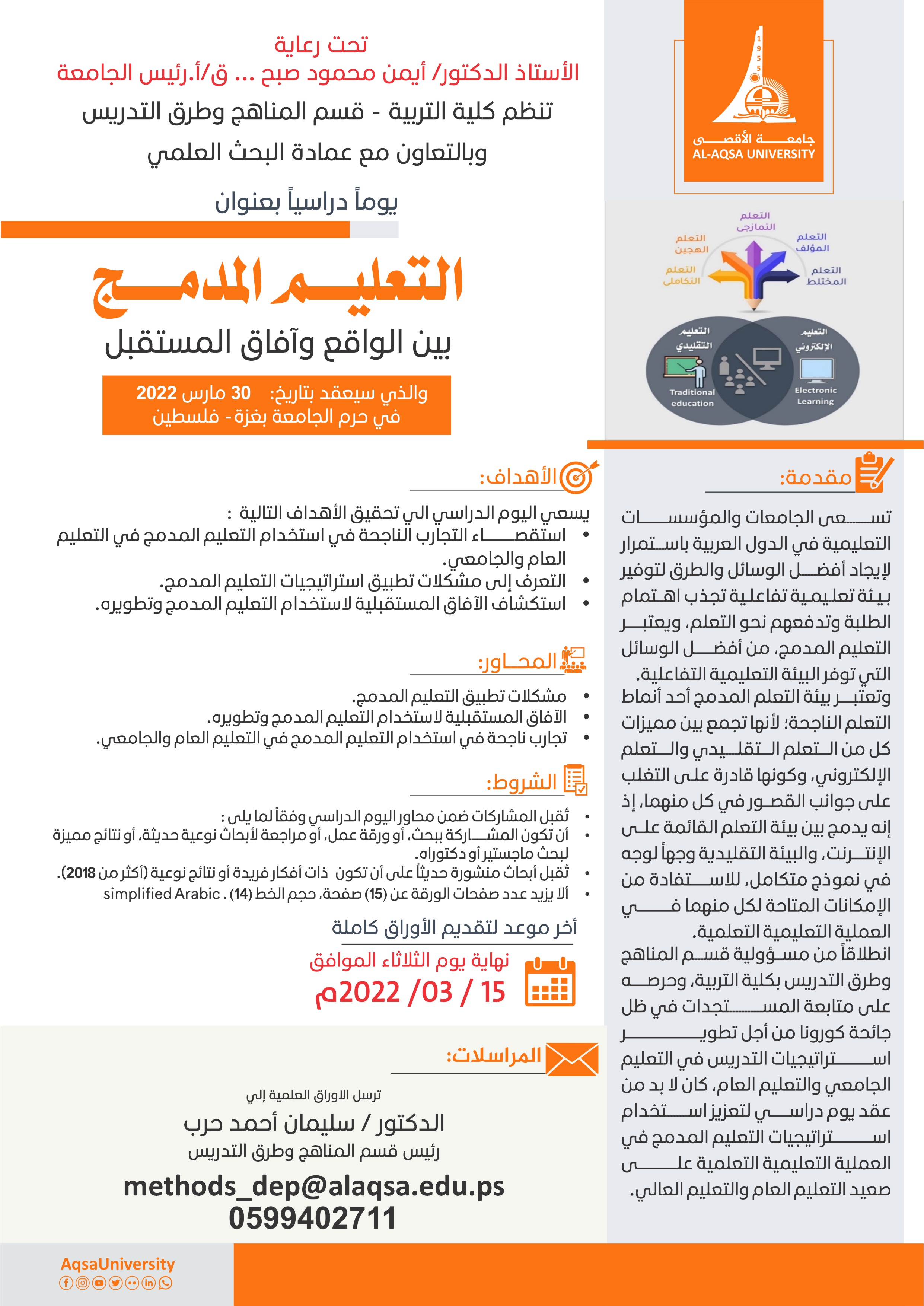 دعوة للمشاركة في اليوم الدراسي الموسوم بـ : التعليم المدمج بين الواقع وآفاق المستقبل (قسم المناهج وطرق التدريس)