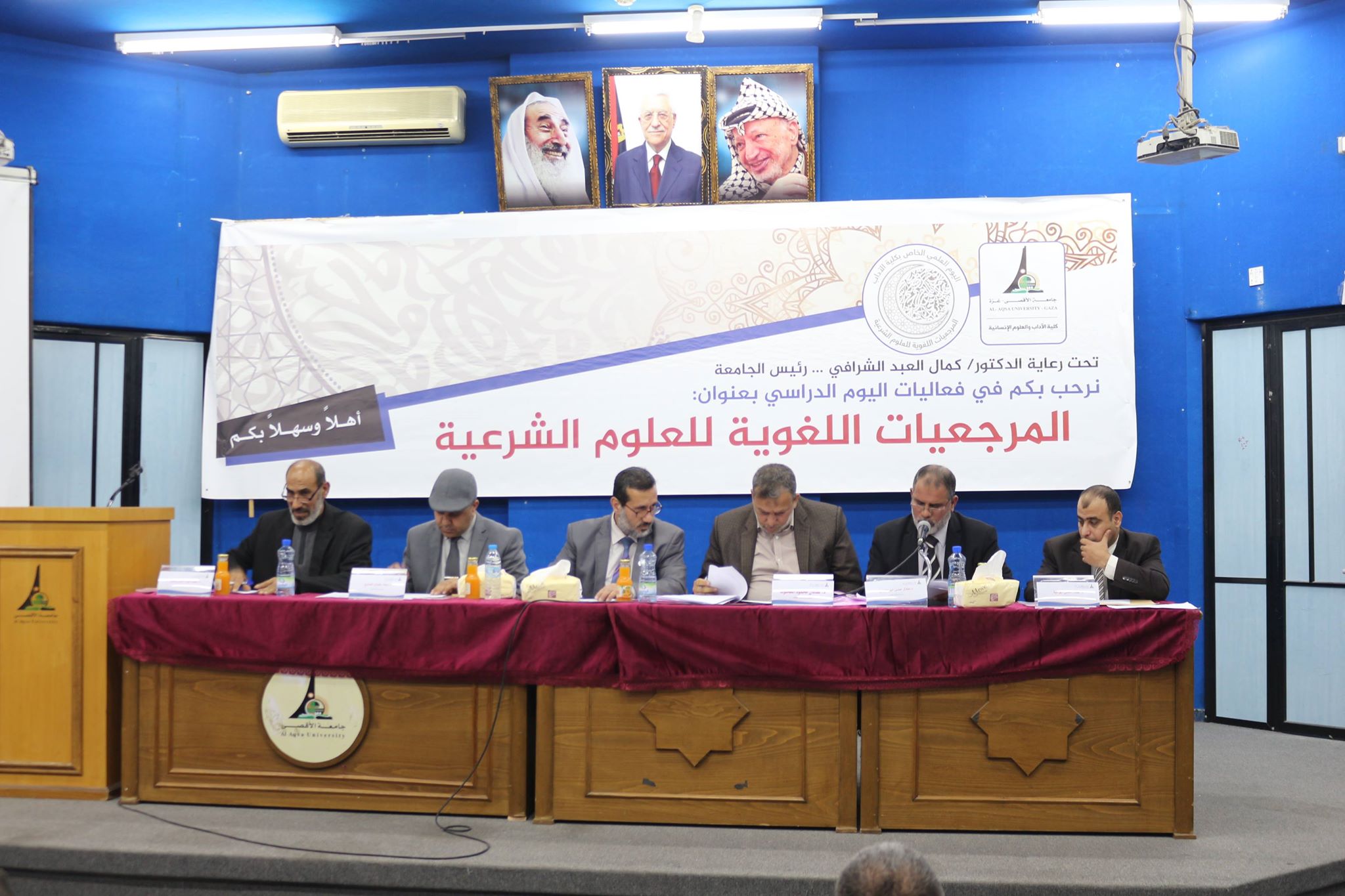 نظم قسمي اللغة العربية والدراسات الإسلامية بكلية الآداب والعلوم الإنسانية بجامعة الأقصى يومياً دراسياً بعنوان المرجعيات اللغوية للعلوم الشرعية وذلك بحضورا.د أيمن صبح نائب رئيس الجامعة للشئون الأكاديمية و ا.د. خالد صافي عميد كلية الآداب والعلوم الإنسانية د. أسامة أبو سلطان رئيس قسم اللغة العربية، و د. عدنان الكحلوت عميد القبول والتسجيل وعدد من أعضاء الهيئتين الأكاديمية والإدارية وحشد من طلاب الجامعة والمهتمين والمختصين.