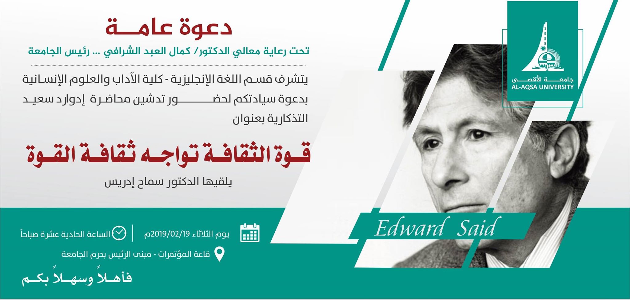 قام قسم اللغة الإنجليزية بجامعة الأقصى يوم الثلاثاء الموافق 19/2/2019 م الساعة الحادية عشرة صباحًا بقاعة المؤتمرات في الجامعة بتدشين محاضرة إدوارد سعيد التذكارية Edward Said Memorial Lecture تخليدًا للمفكر المرموق وتعزيزًا لإرثه الثقافي البالغ التأثير على الساحات الإقليمية والعالمية. افتتح المحاضرة رئيس قسم اللغة الإنجليزية، الدكتور محمود محمد الحرثاني مبينًا القيمة الفكرية الكبيرة لإدوارد سعيد وإرثه الثقافي ومؤكدًا على أن هذا التكريم الذي يعد الأول من نوعه في فلسطين يأتي ضمن مساعي قسم اللغة الإنجليزية للإسهام النوعي في الدراسات الثقافية داخل الجامعة وخارجها إذ يربطها مع محيطها المحلي والإقليمي والدولي. تلى ذلك عرض فيلم وثائقي قصير، بحضور رئيس الجامعة الدكتور كمال الشرافي الذي رحب بالحضور وأكد على ضرورة مثل هذه الفعاليات، عن حياة إدوارد سعيد تبعته كلمة ترحيبية من عميد كلية الآداب أ. د. خالد صافي الذي أشاد بالفكرة وبجهود قسم اللغة الإنجليزية في هذا المضمار الهام.