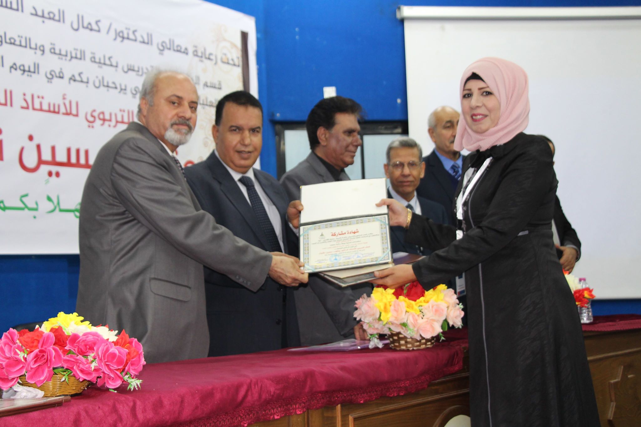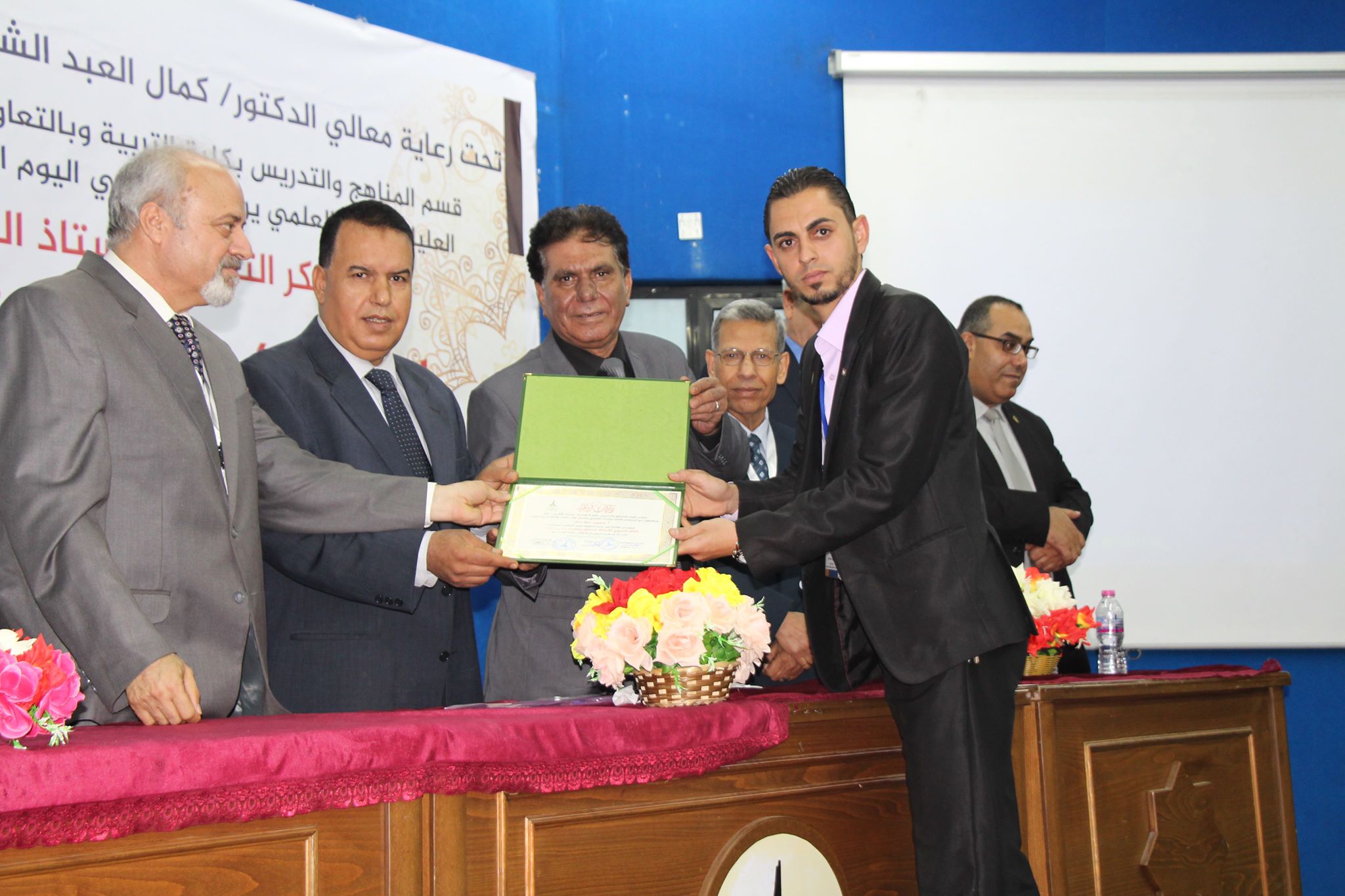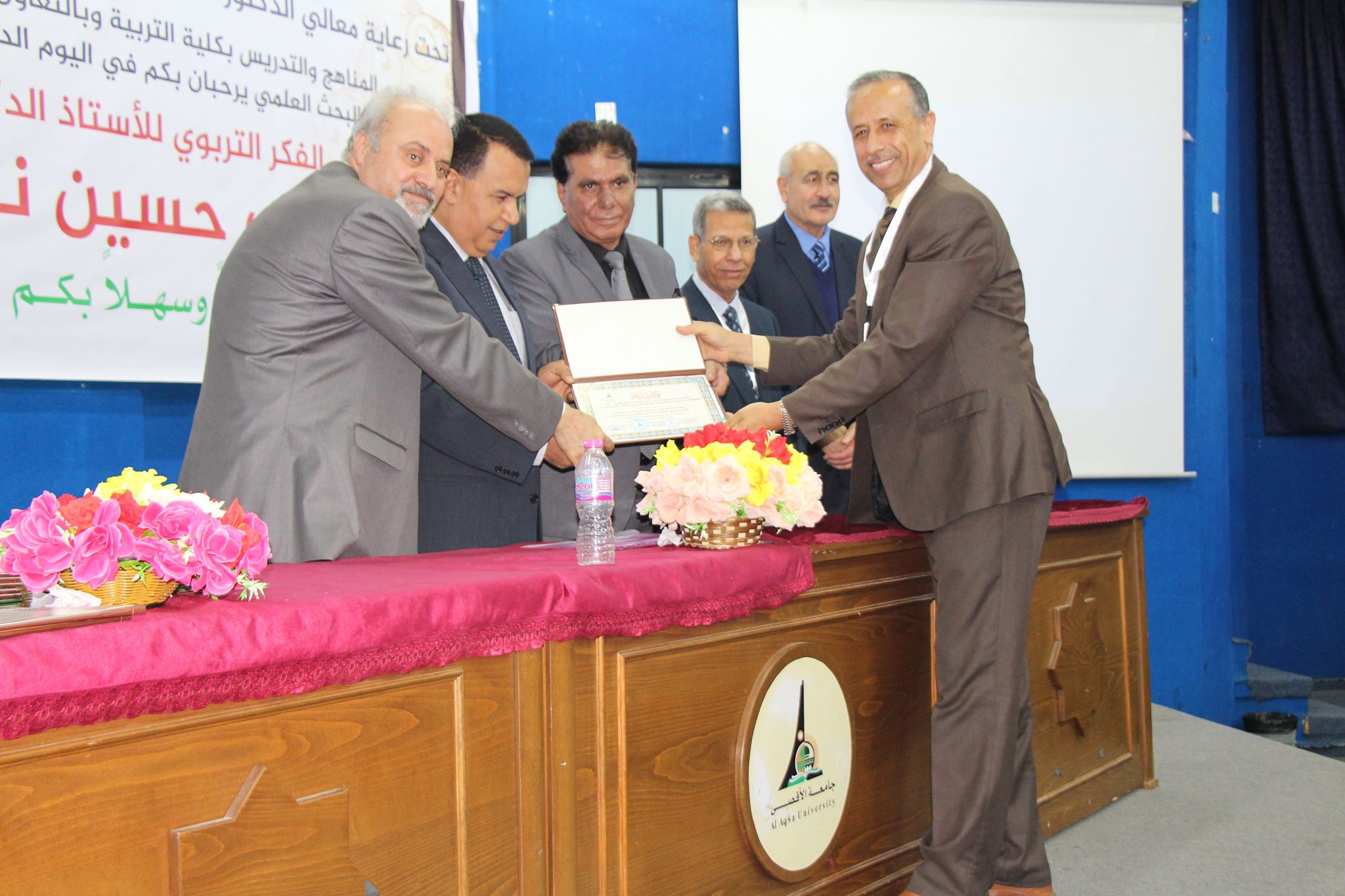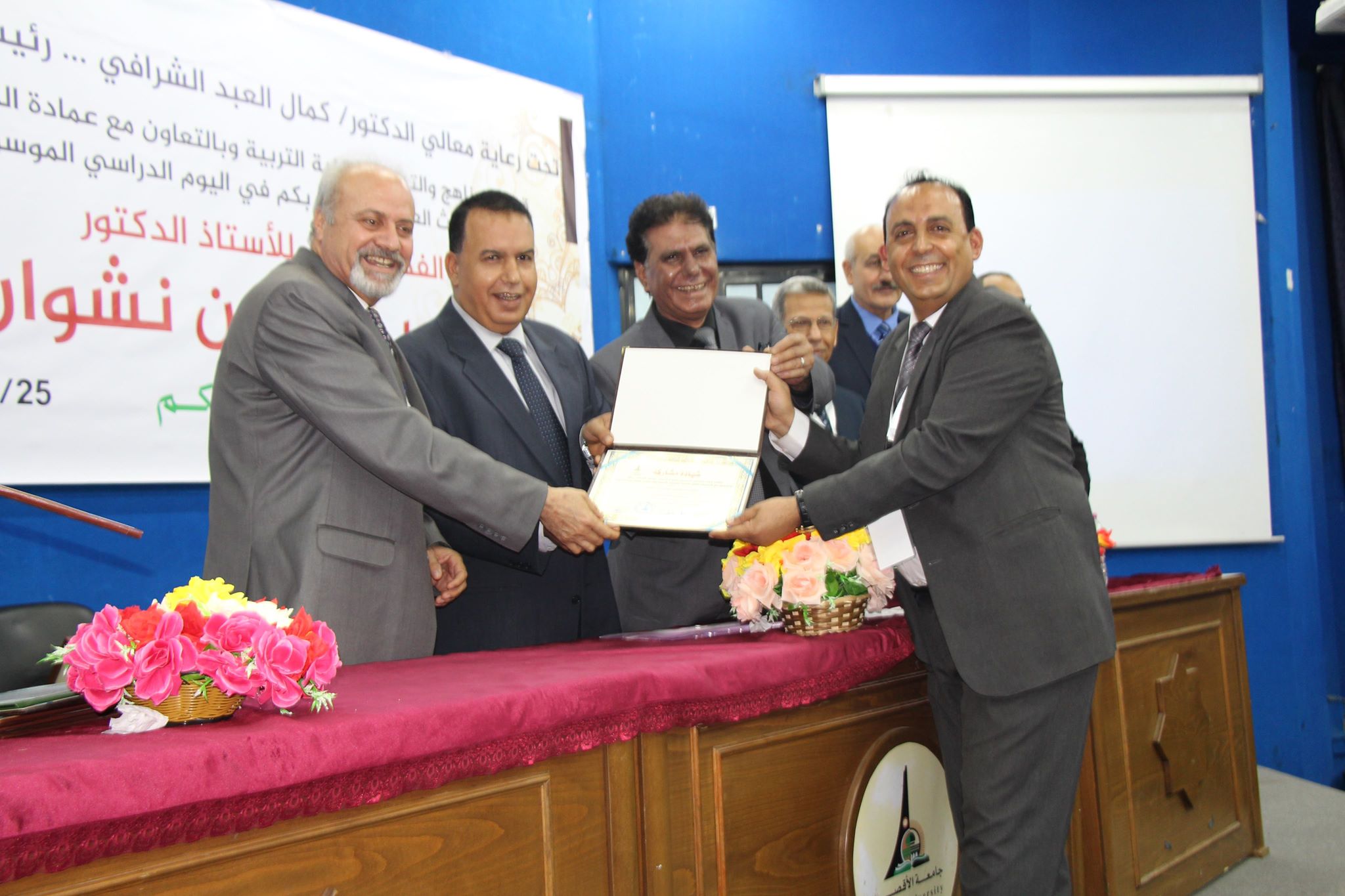 وفي نهاية اليوم الدراسي تم توزيع دروع تكريمية وشهادات تقدير للمشاركين في اليوم الدراسي ولعائلة نشوان .
