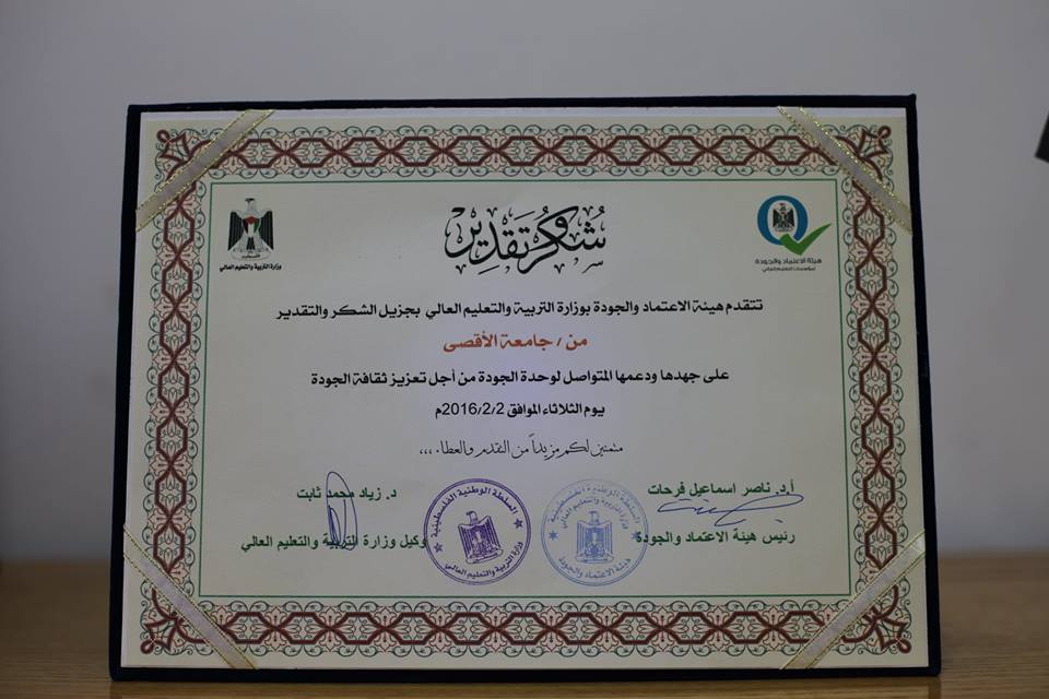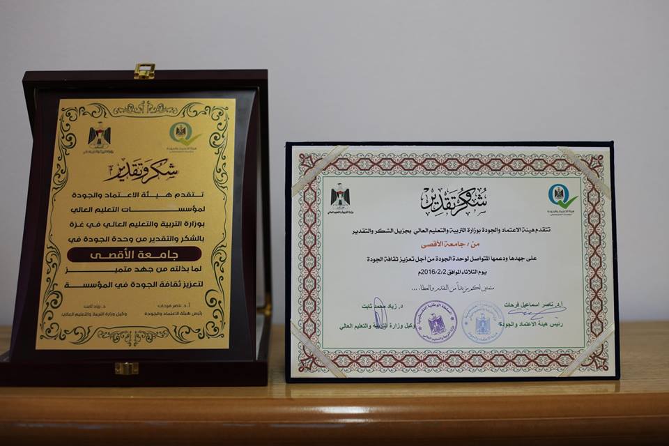علماً بأن هذه المشاركة تأتي ضمن رسالة ورؤية الجامعة على نشر وتطوير الجودة داخل الجامعة ، كما يعزز من تواصل بين المؤسسات الفلسطينية ، وتعتبر الجامعة هي ضمن خمس مؤسسات تم تكريمهم خلال الحفل