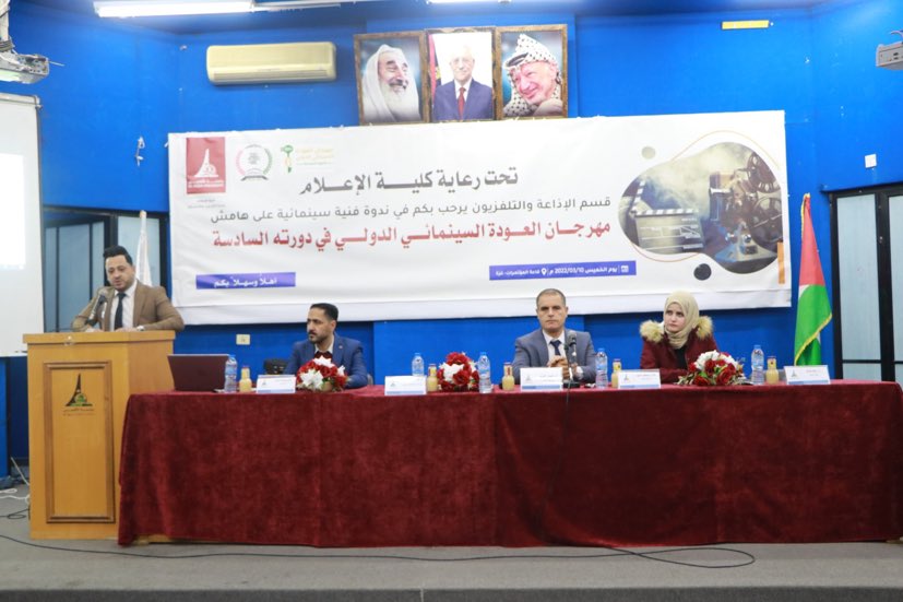 نظمت كلية الإعلام بجامعة الأقصى ندوة فنية سينمائية على هامش مهرجان العودة السينمائي الدولي في دورته السادسة، وذلك بحضور عميد كلية الإعلام د. غسان حرب، وعميد الكلية السابق د. أحمد مغاري، ورئيس قسم الاذاعة والتلفزيون د. محمد ابو زايد، ورئيس قسم العلاقات العامة د. أحمد حماد، ومدير التدريب في الكلية أ. غسان مقداد، ومدير المهرجان المخرج يوسف خطاب، ومنسق المهرجان أ. نظام مهنا، بالإضافة لمدير العلاقات العامة للمهرجان أ. دعاء صالح، ولفيف من المثقفين والأكاديميين والطلبة.