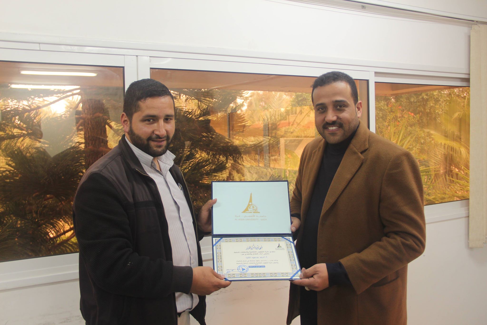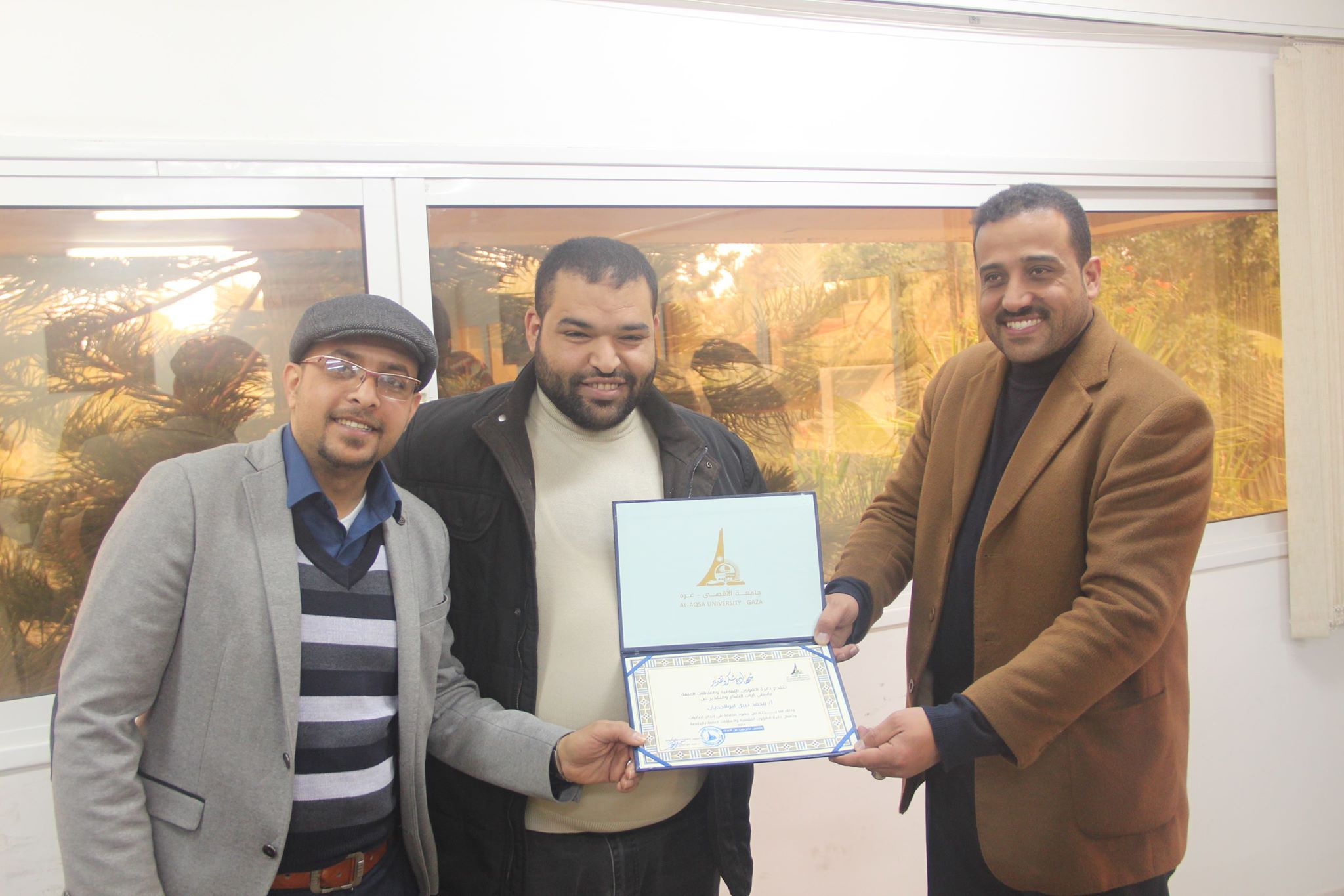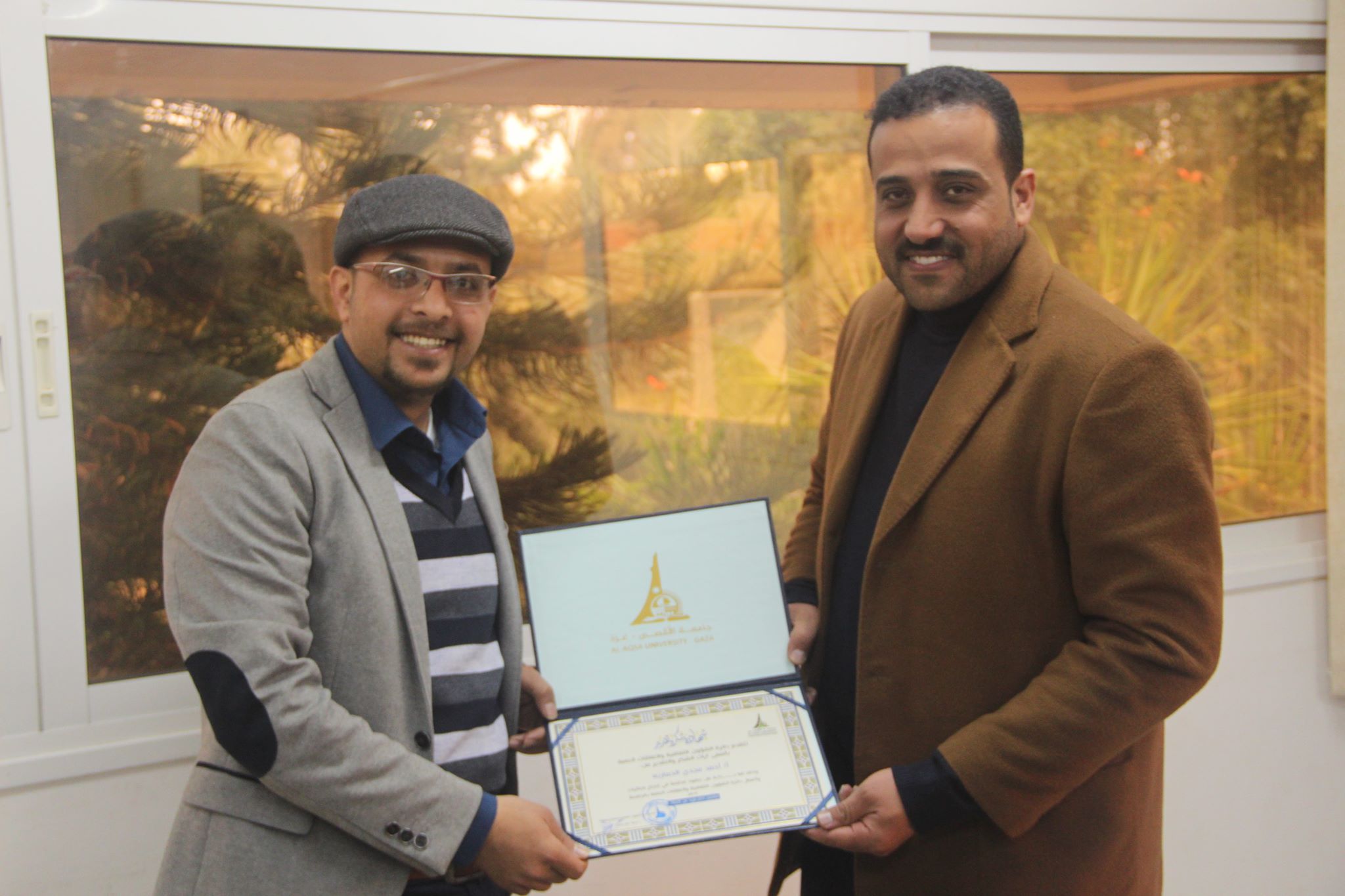 كرم مدير الشؤون الثقافية والعلاقات العامة بالجامعة د. محمد عمر حمدان موظفي الدائرة، وذلك خلال اجتماعه بهم في فرع الجامعة بخانيونس ، في ظل أجواءٍ تشوبها روح المحبة والاخاء ، وجاء هذا التكريم تقديراً لجهود موظفي الدائرة خلال الفترة السابقة ، ومشاركتهم في الاعداد والتنسيق والتنفيذ للعديد من الفعاليات والأنشطة الناجحة ، والتي كان لها صدىً اعلامياً ناجحاً على نطاق المجتمعين الداخلي والخارجي للجامعة.