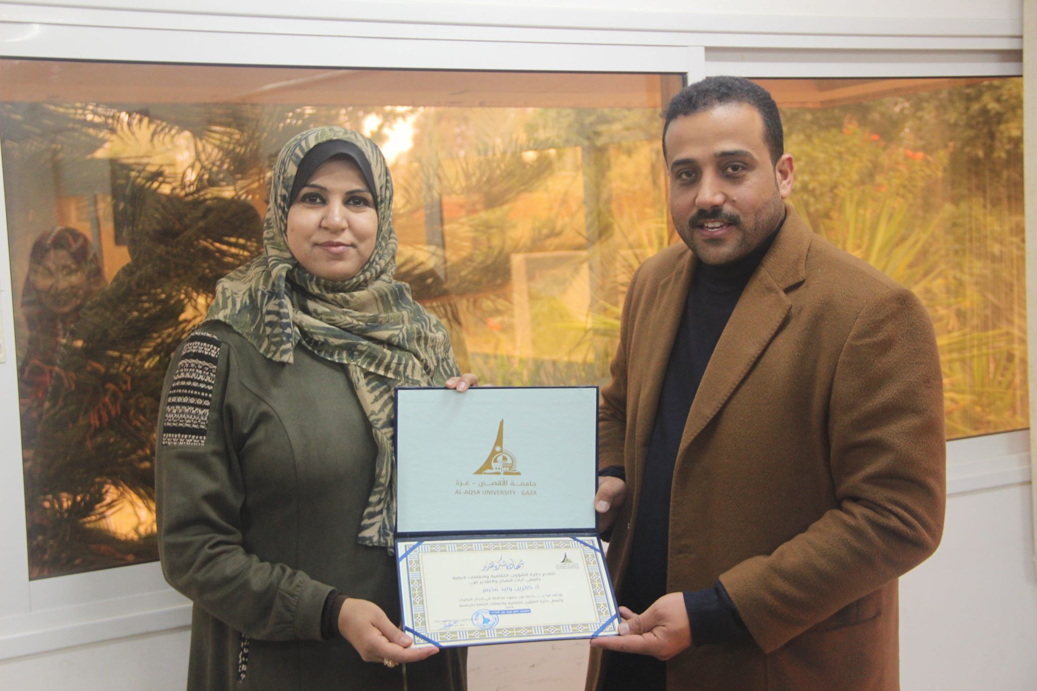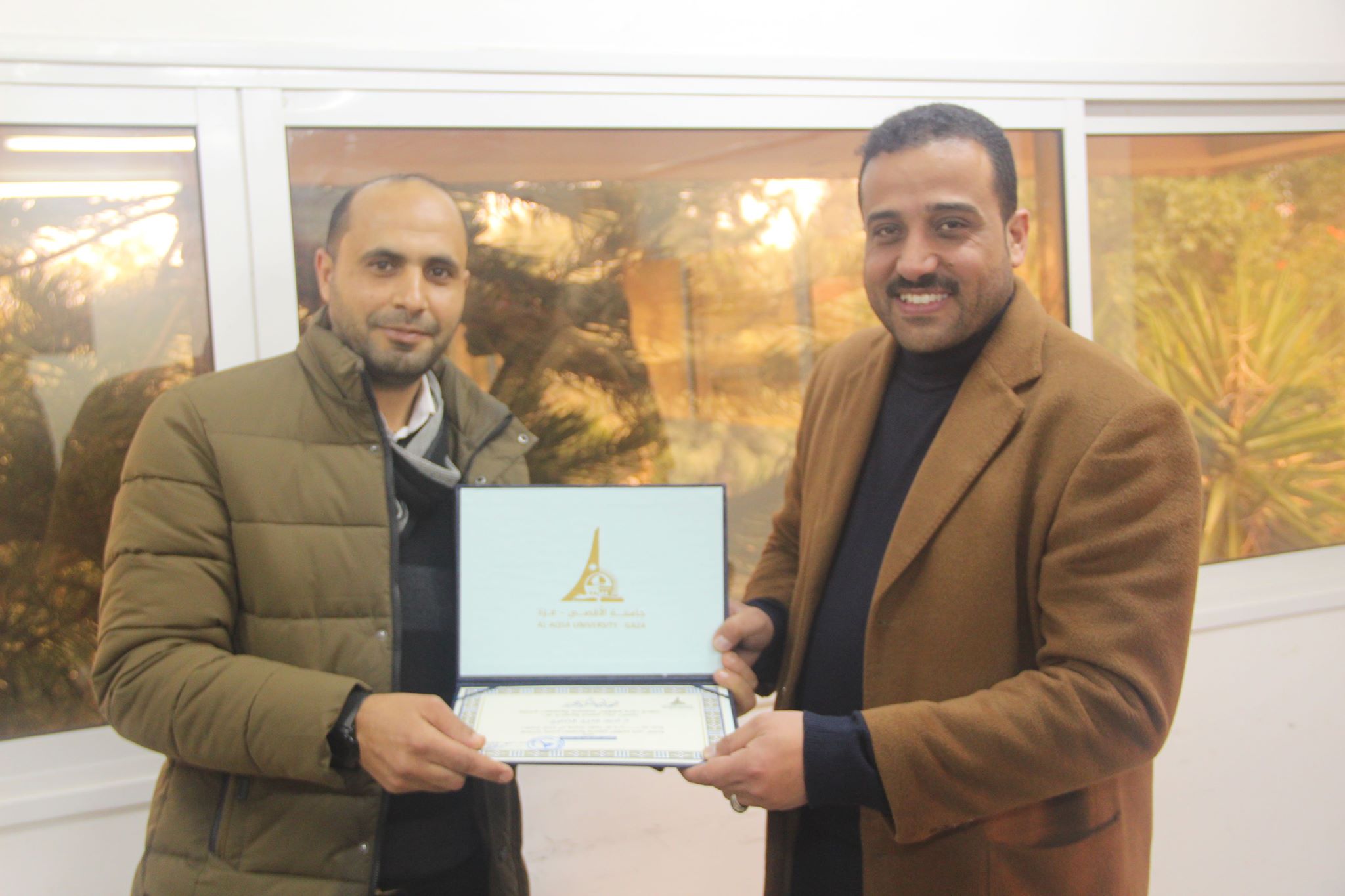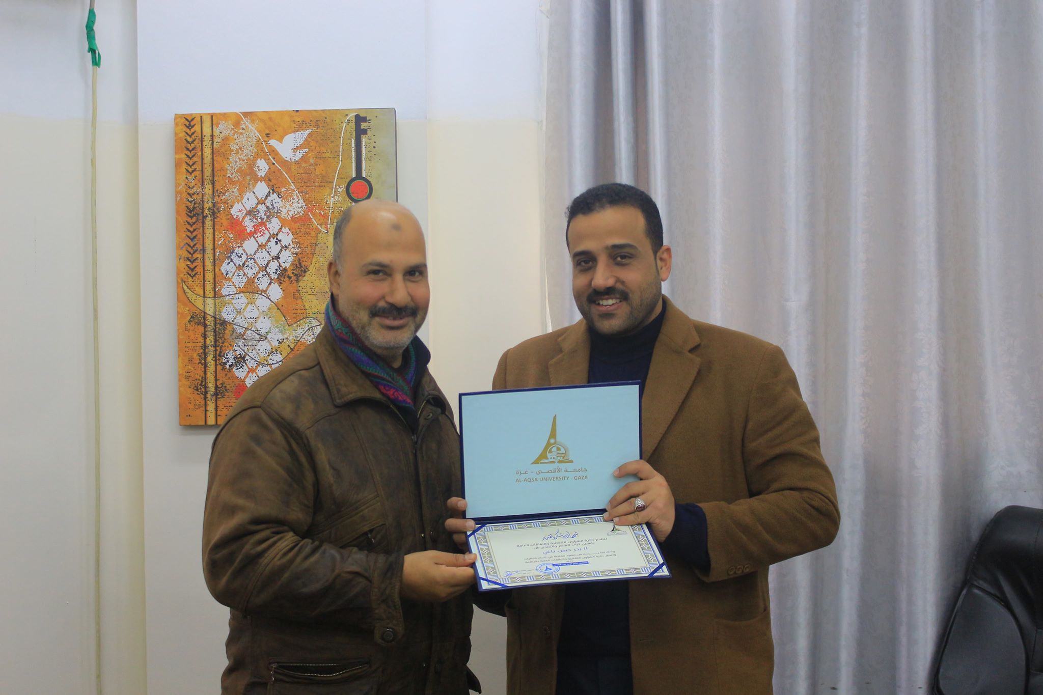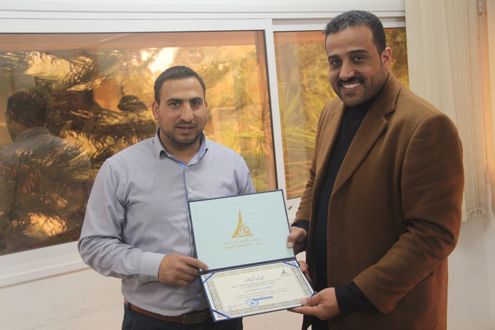 كرم مدير الشؤون الثقافية والعلاقات العامة بالجامعة د. محمد عمر حمدان موظفي الدائرة، وذلك خلال اجتماعه بهم في فرع الجامعة بخانيونس ، في ظل أجواءٍ تشوبها روح المحبة والاخاء ، وجاء هذا التكريم تقديراً لجهود موظفي الدائرة خلال الفترة السابقة ، ومشاركتهم في الاعداد والتنسيق والتنفيذ للعديد من الفعاليات والأنشطة الناجحة ، والتي كان لها صدىً اعلامياً ناجحاً على نطاق المجتمعين الداخلي والخارجي للجامعة.