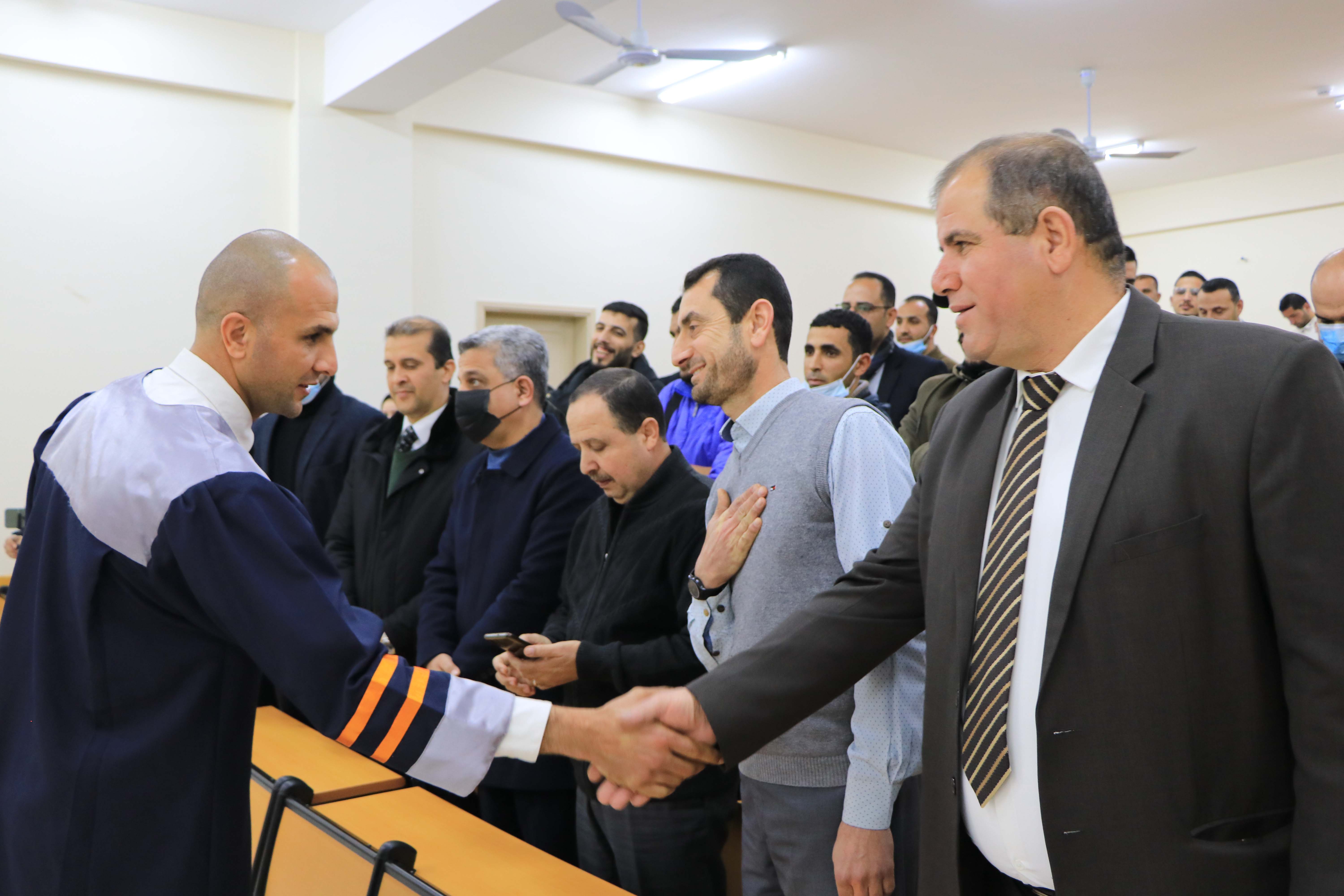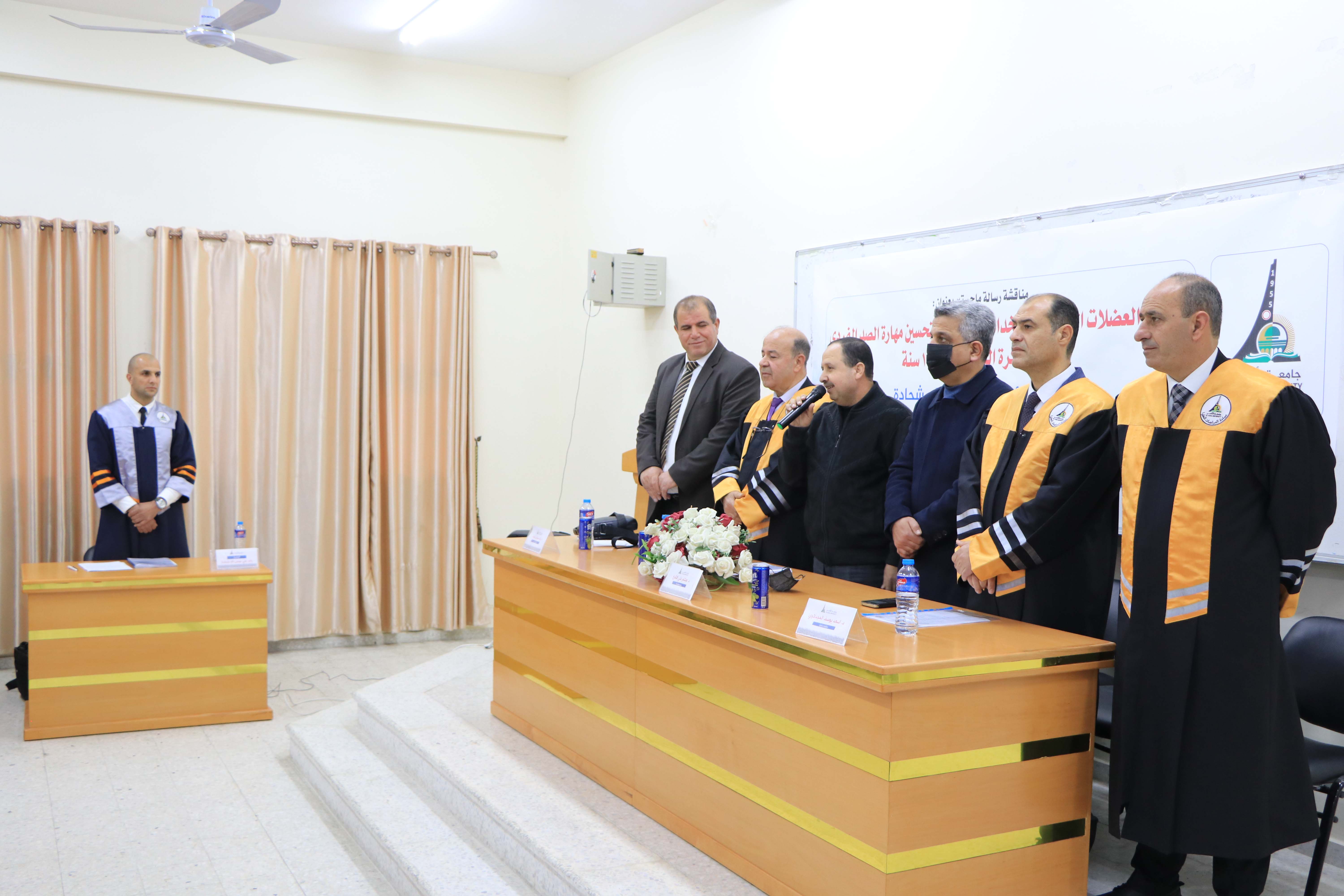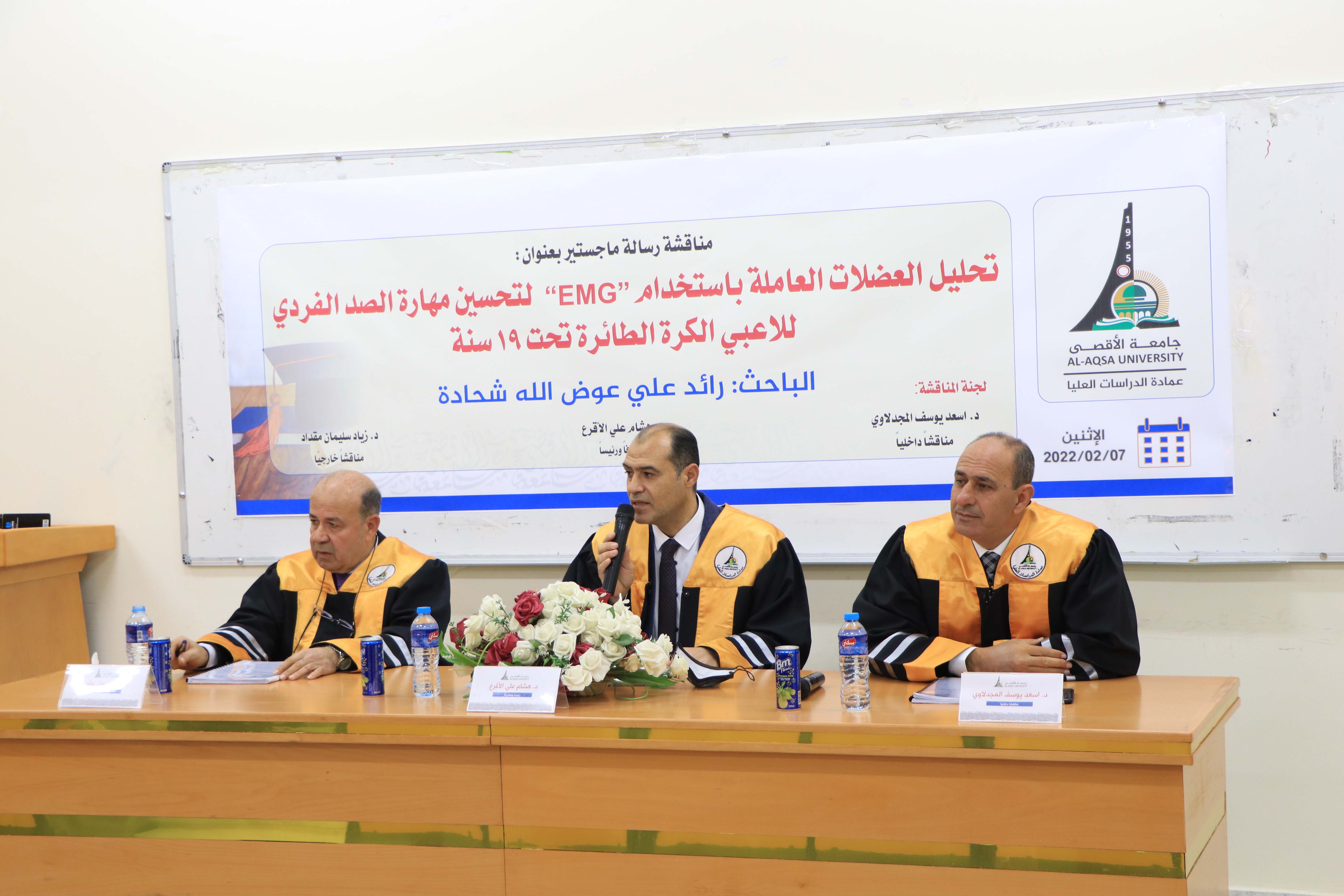 ناقشت عمادة الدراسات العليا بجامعة الأقصى رسالة ماجستير تخصص تربية رياضية تعتبر الأولى في قطاع غزة، والمقدمة من الباحث رائد علي عوض الله شحادة والموسومة بـ "تحليل العضلات العاملة باستخدام""EMG لتحسين مهارة الصد الفردي للاعبي الكرة الطائرة تحت 19 سنة"، وذلك بمقر الجامعة الرئيس بغزة اليوم الاثنين 07/02/2022م، بحضور القائم بأعمال رئيس الجامعة أ.د.أيمن محمود صُبح والنائب الأكاديمي د.رائد الحجار وعميد كلية التربية البدنية والرياضة د.أحمد حمدان، وعدد من أعضاء الهيئة التدريسية بالجامعة.