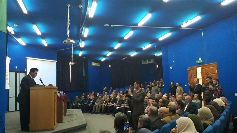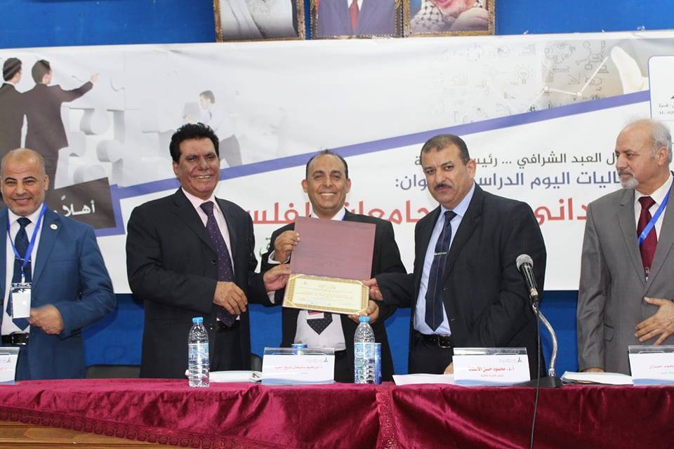 وفي كلمته شكر معالي د. الشرافي اللجان القائمة على تنظيم اليوم الدراسي مثمناً دورهم في إنجاح أهداف هذا اليوم متمنياً الخروج بمصطلحات فلسطينية بحتة تناسب البيئة التعليمية الفلسطينية.